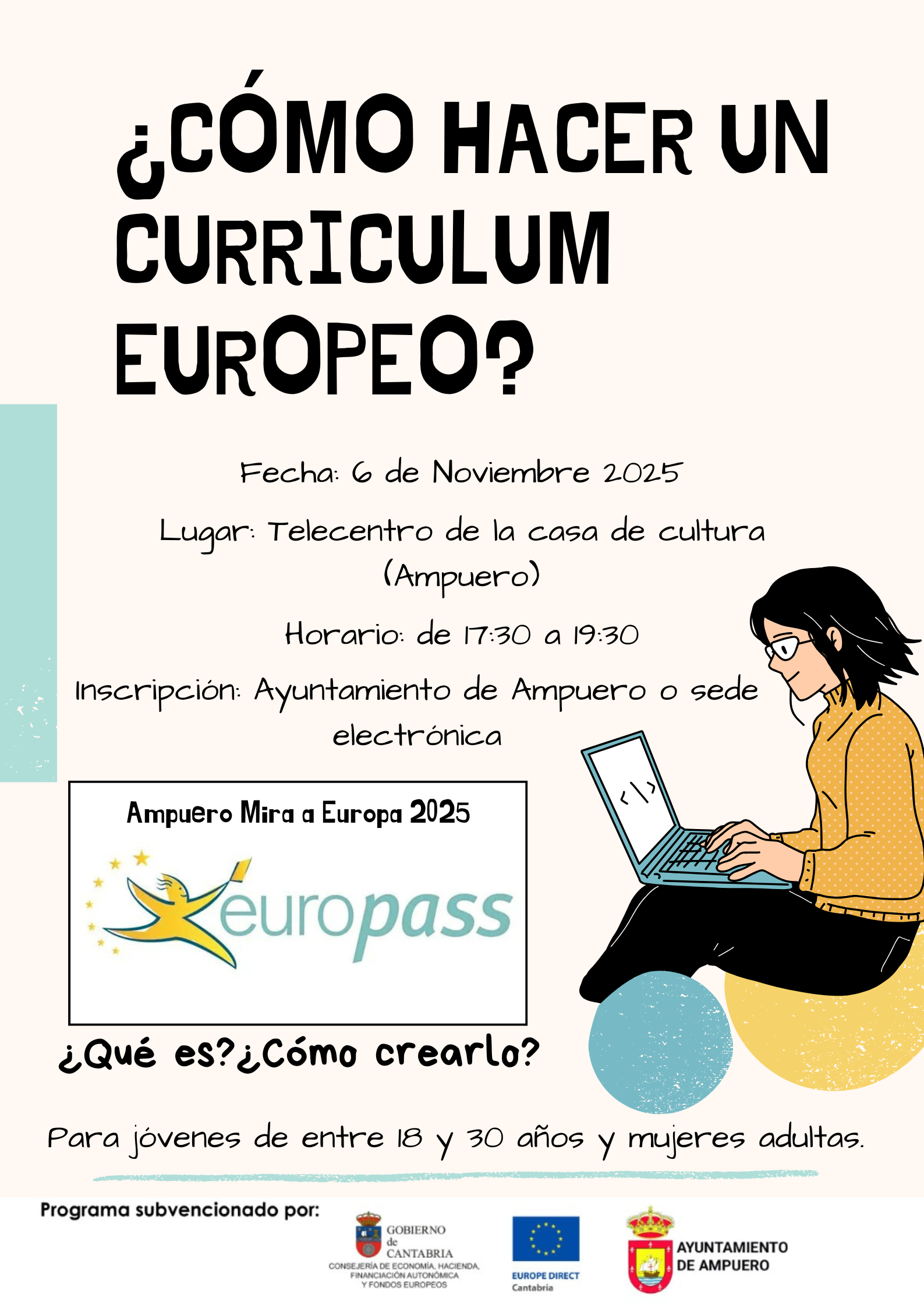 Formación CurrículumEuropeo. Programa Ampuero Mira a Europa 2025 Ver imagen más grande Formación CurrículumEuropeo ¿Quieres aprender a hacer tu Currículum Europeo y mejorar tus oportunidades laborales? Programa Ampuero Mira a Europa 2025 Fecha: 6 de noviembre Hora: 17:30 – 19:30 Lugar: Telecentro Inscripciones: En el Ayuntamiento A través de la Sede Electrónica Dirigido a: Jóvenes de 18 a 30 años Mujeres adultas ¡GRATUITO! No te lo pierdas y da un paso más hacia tu futuro profesional. Ampuero Ampuero2025-10-30T12:52:48+00:00Noticias| ¡Compártelo en las redes! FacebookTwitterLinkedInRedditTumblrPinterestCorreo electrónico Artículos relacionados CURSO DE OBTENCIÓN DE CERTIFICADO ELECTRÓNICO dentro del programa Ampuero Mira a Europa 2025 30 Oct 2025 Plan de Beating Cancer de Europa. La proyección salva vidas: Pink October 24 Oct 2025 La Comisión Europea adopta nuevas medidas para promover un entorno seguro para los menores 16 Oct 2025